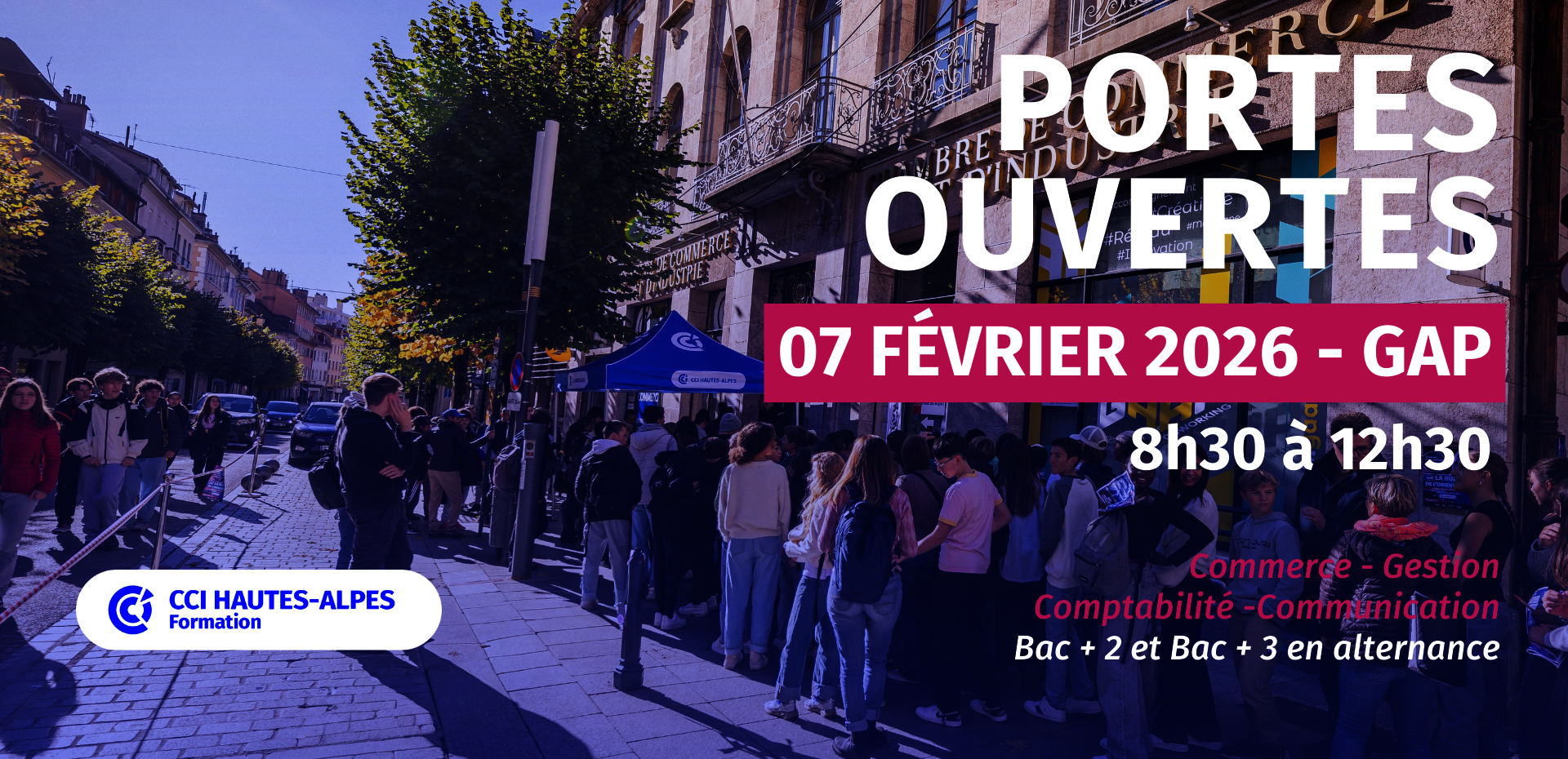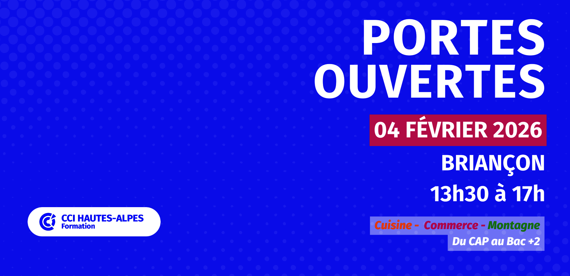 Envie d’une formation qui fait la différence dans l’emploi local ? La CCI Hautes‑Alpes Formation vous ouvre ses portes pour découvrir ses parcours en alternance et en formation continue, du CAP au Bac+3 (et au‑delà), dans les secteurs commerce/tourisme, montagne, cuisine, numérique, langues, et plus encore.